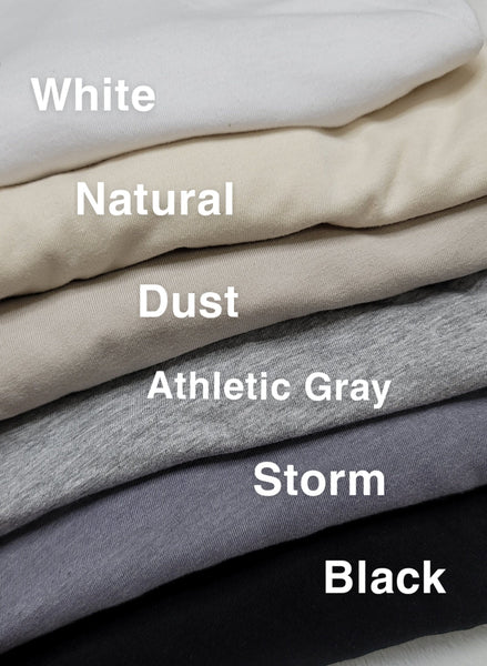 If you would like a tee color other than those listed in the drop down menu, select 'custom' and note your color choice in the provided box. Please note that not all colors and sizes are available. You can either note a second choice or we will contact you if there is an issue. Print color cannot change.